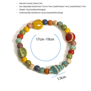 Handmade Colorful Starfish & Seashell Ceramic Beaded Bracelet Adjustable Stretch Boho Beach Jewelry Elastic Wristband for Women & Teens S001186