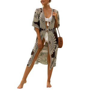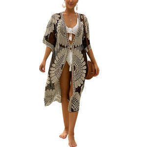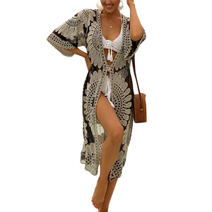 Women´s New Long Swimsuit Cover Up Half Sleeve Floral Crochet Open Front Kimono Fashion Beach Cardigan