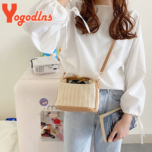 Yogodlns Summer Small Straw Handbag Trendy Shoulder Bag Woven Bucket Crossbody Bag Casual Seaside Beach Bag Gilrs Handle Tote